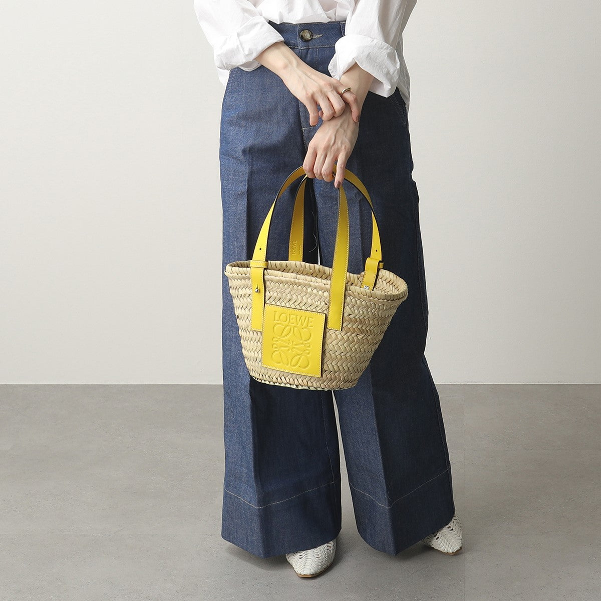 商品説明: アイコンロゴがエンボスデザインされたレザーパッチが印象的なラフィア素材のバスケットトートバッグ。シンプルでモダンなアナグラムが上品な雰囲気を漂わせます。