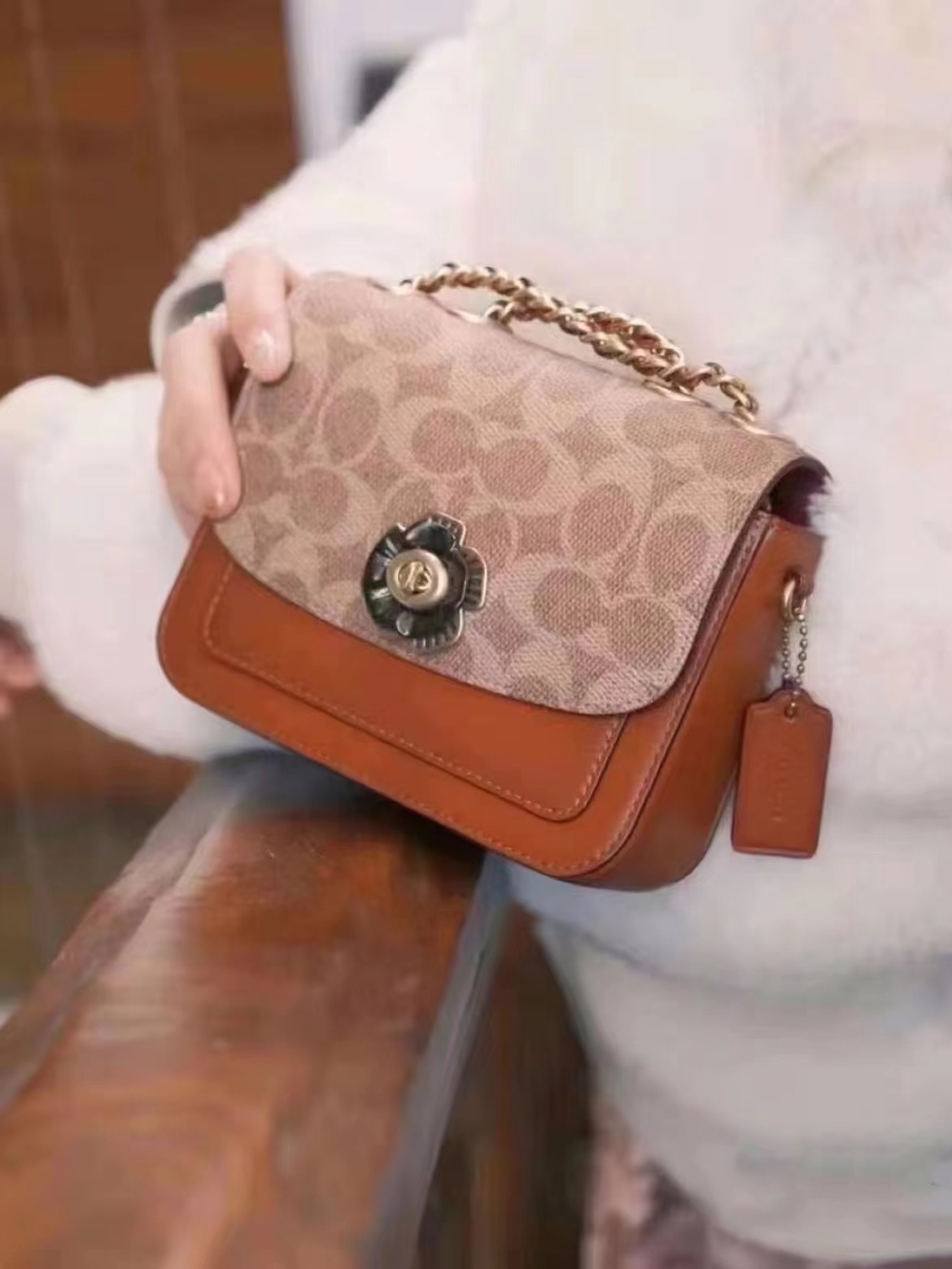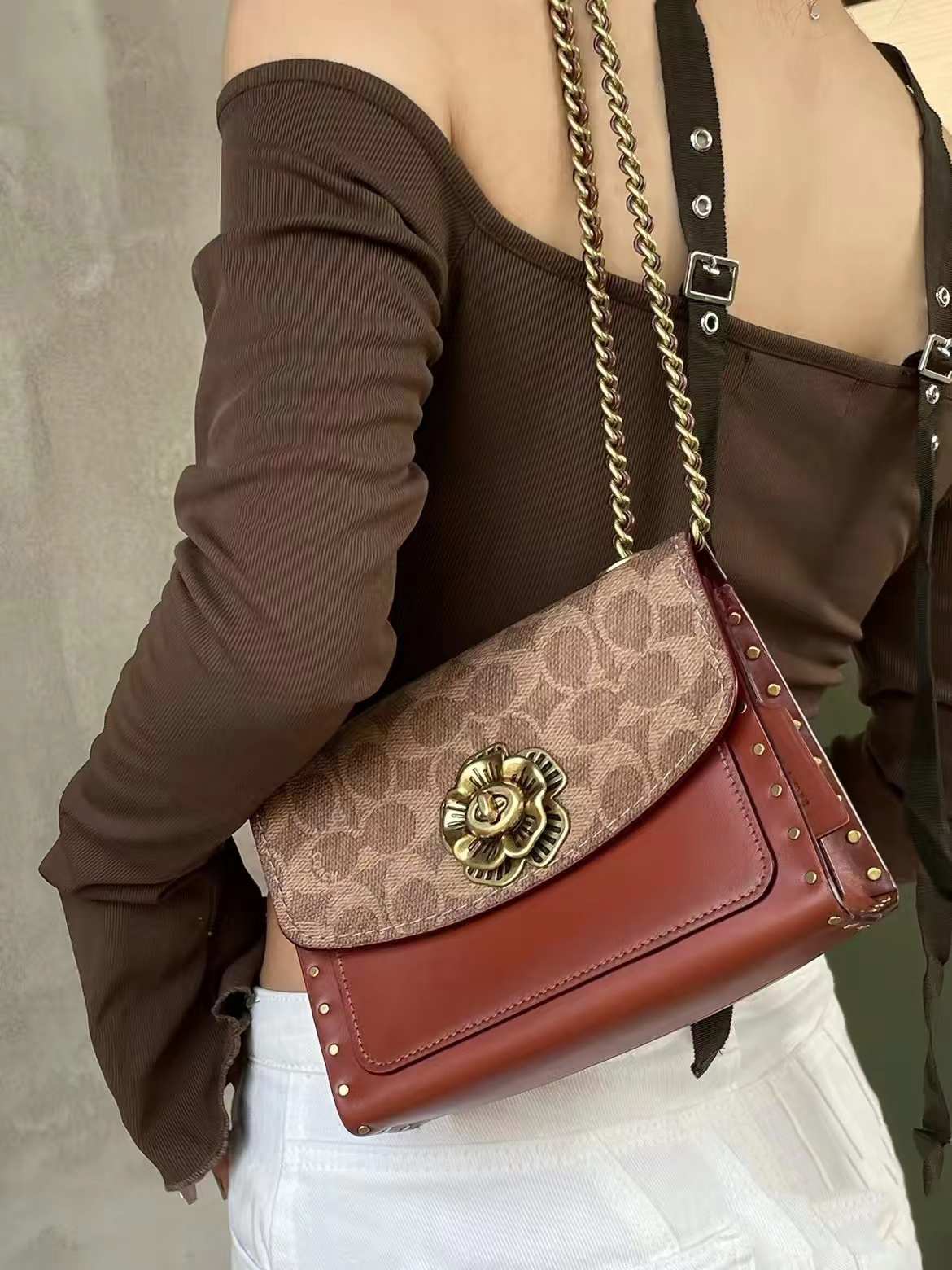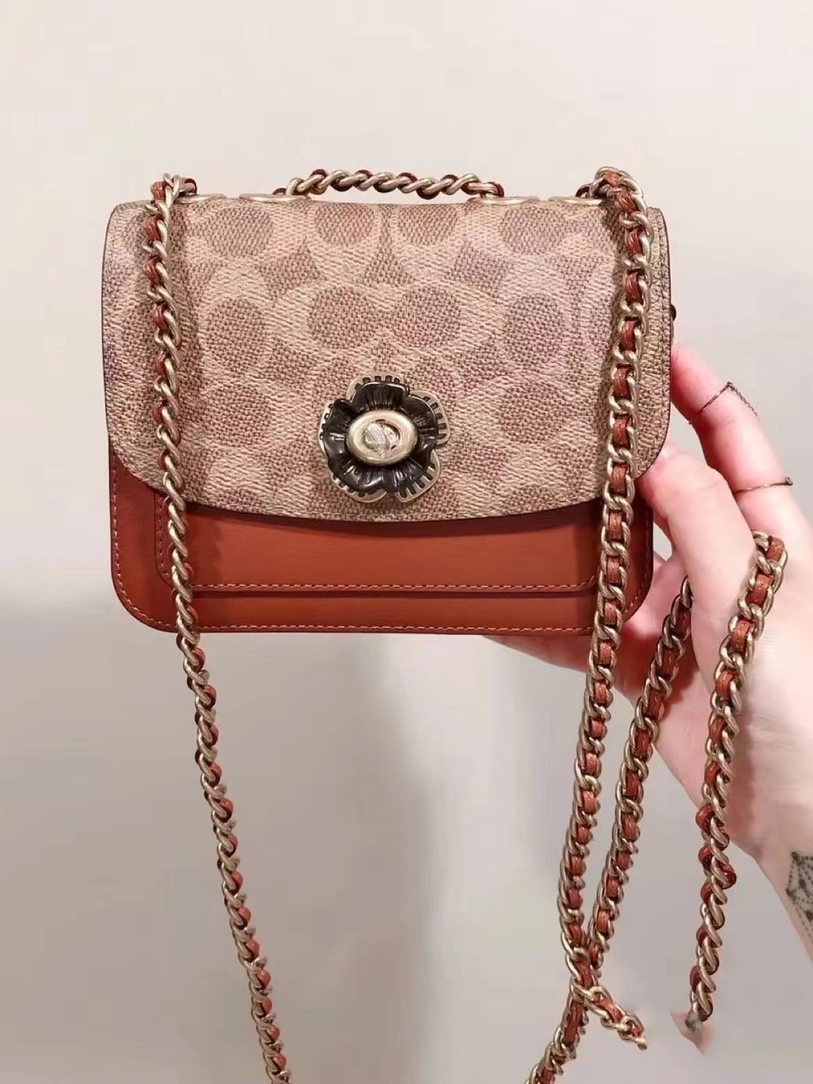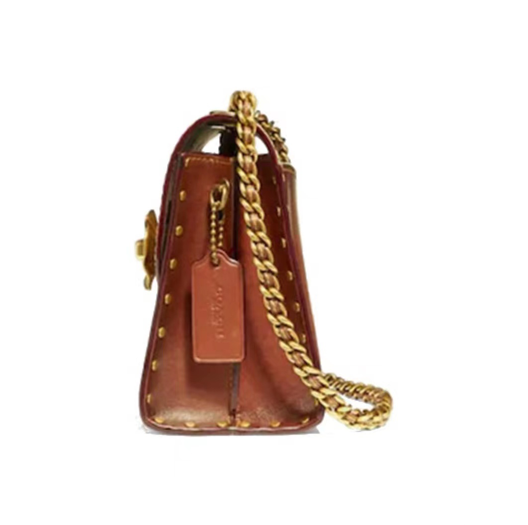 COACHクリッツパーカーシリーズ18リベットツバキ チェーンカバーキャンバスに皮付きショルダーバッグトランペット女性カーキに茶色の老花