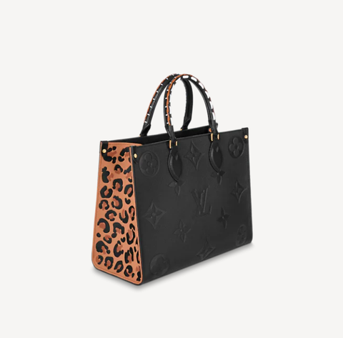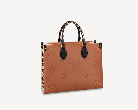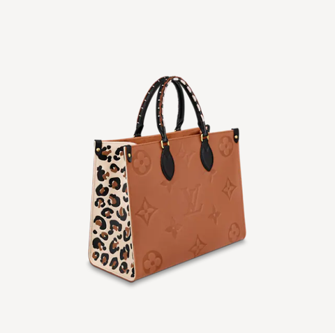 2021年の「ワイルド・アット・ハート」カプセル・コレクションに登場した「オンザゴー MM」。艶やかなモノグラム・パターンのエンボス加工が特徴のモノグラム・アンプラント レザーで仕立て、サイドにはレオパード・プリントをあしらいました。編み上げレザー製のトップハンドルと長めのレザーストラップで、さまざまな持ち方をお楽しみいただけます。その名の通り、女性の必需品をしっかり収納できるアイテムです。